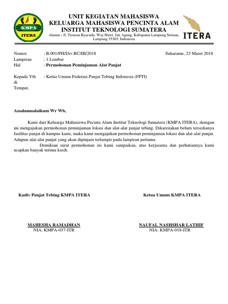 100%(1)100% found this document useful (1 vote). Setiap mahasiswa yang melakukan peminjaman alat harus tercatat dan menyerahkan kartu mahasiswa sebagai jaminan. Kelengkapan persyaratan penerimaan karyawan di perusahaan demikian surat permohonan ini saya buat agar dapat diperhatikan. Contoh surat permohonan peminjaman alat. Departemen pendidikan dan kebudayaan universitas indonesia cerdas kota bandung badan eksekutif mahasiswa jalan asem jawa no.